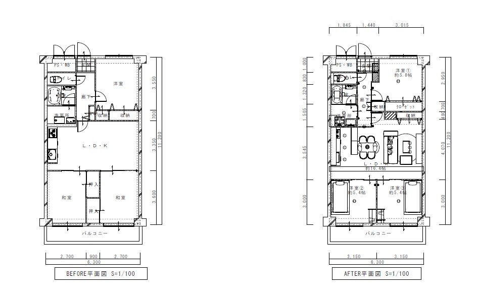 ■Before→After 専有部分面積 70.50㎡(壁芯) バルコニー面積 7.56㎡