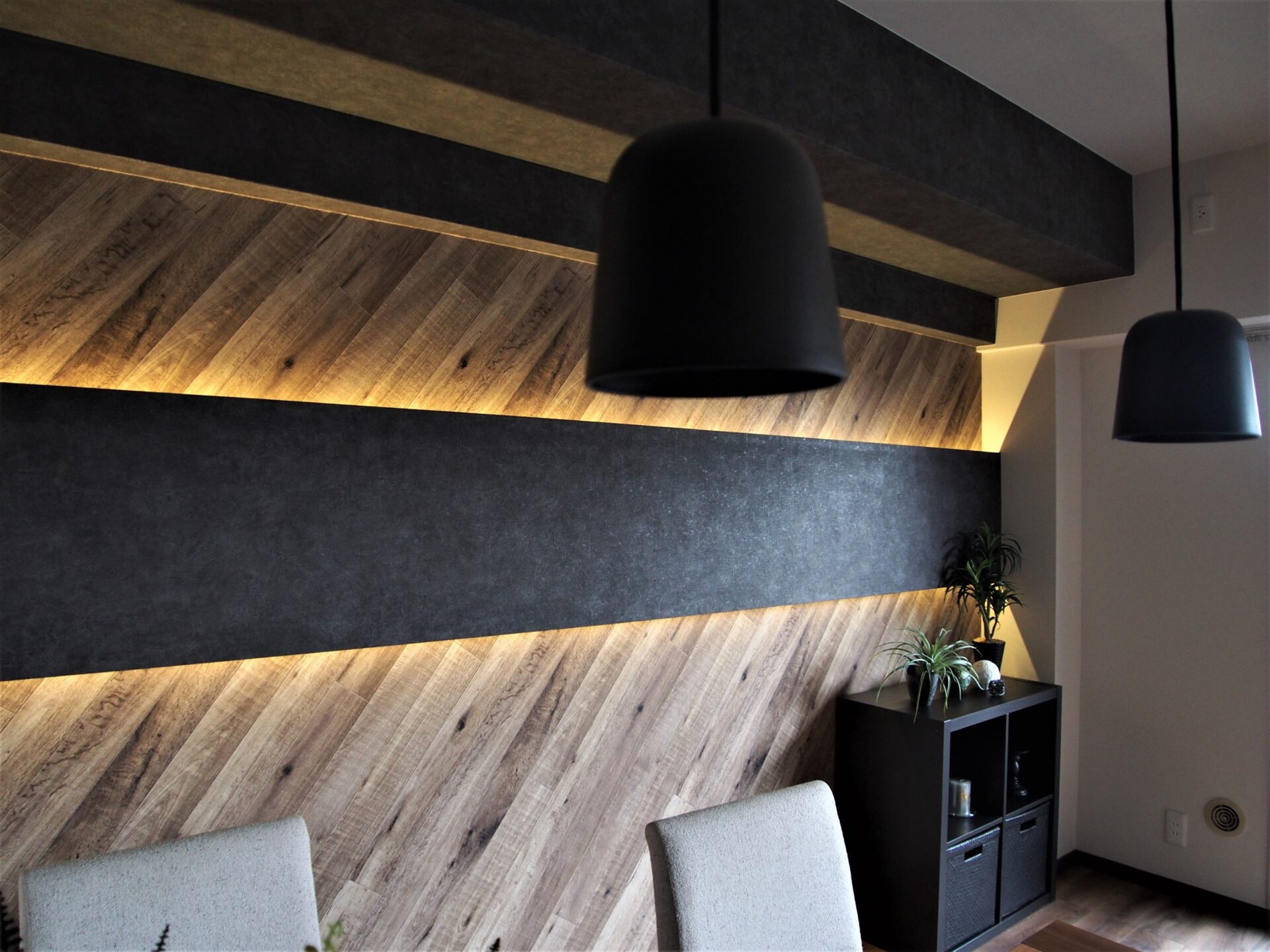 シームレスな光のラインが映える、間接照明を上手く取り入れたインダストリアル内装 中古マンション 大阪府枚方市 CHECK! 照明で遊ぶ、大人の隠れ家リノベーション こだわりポイント こだわり抜いた照明で、お部屋全体の空気感を格上げ。 LDKはダクトレールを新設し、照明の位置も自由にレイアウト可能になりました。 建具・床・アクセントクロスなどは落ち着いたダークトーンで揃えれば、大人の隠れ家的雰囲気に。 工事概要 完工日 2020/12/11 建物概要 中古マンション 施工期間 1ヶ月 Before After 比較 Before画像 After画像 Gallery