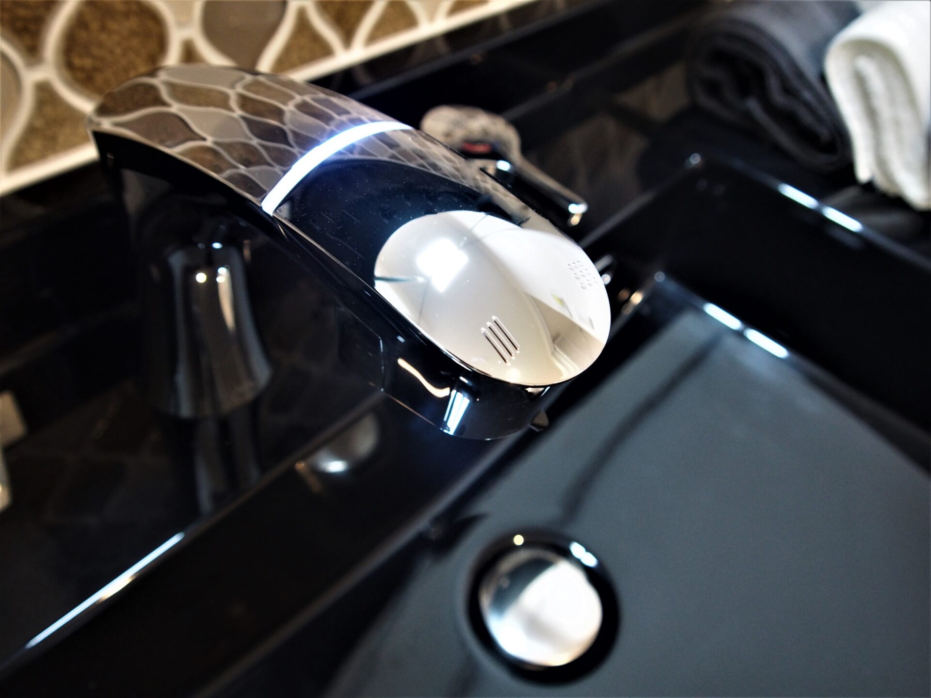 一面に施工したエコカラットは、質感を楽しめる「つちのは(鈍色/LIXIL)」を採用。