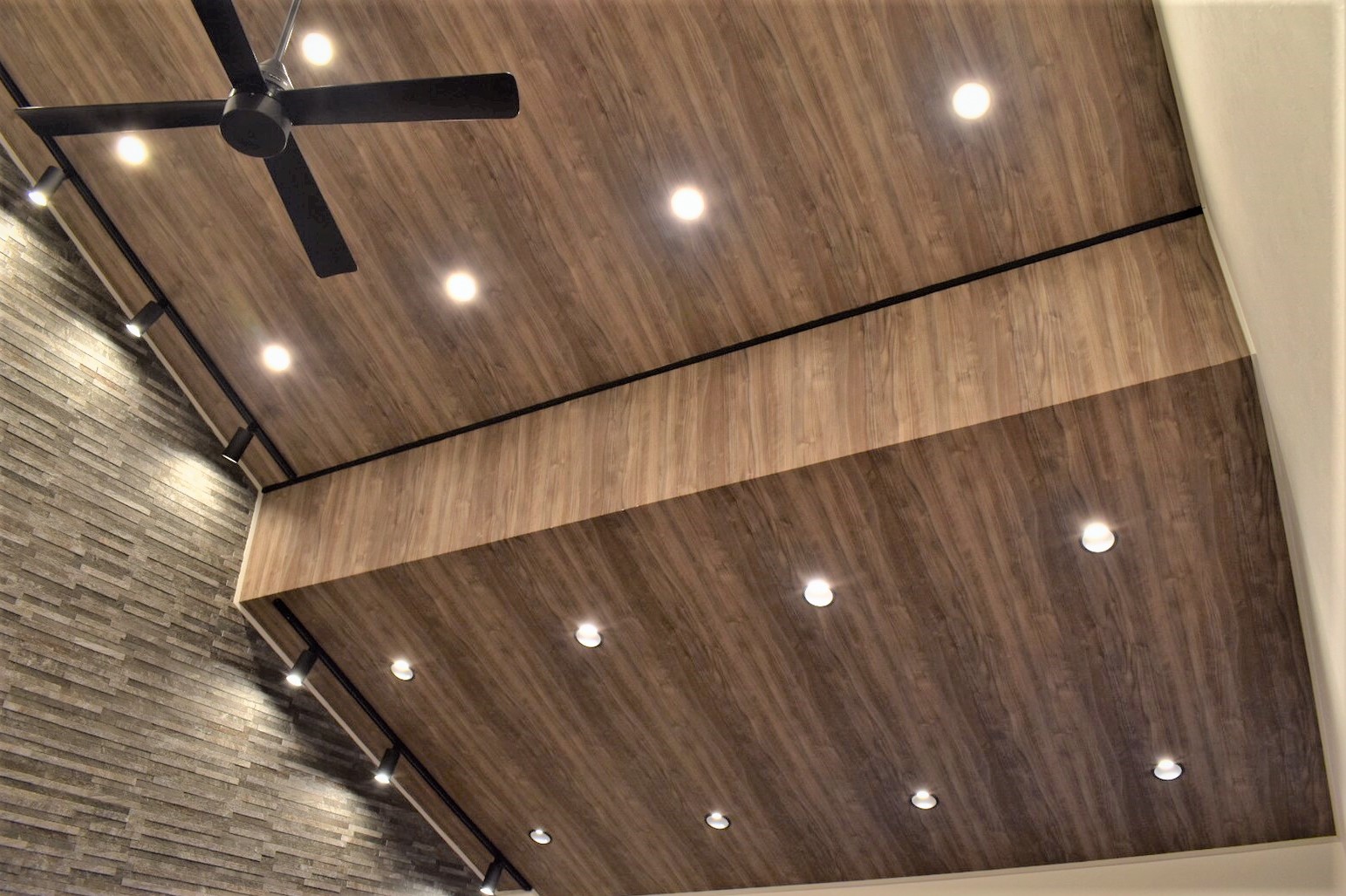 壁一面にエコカラットタイル、天井には木目のクロスを。各所に照明を仕込めば、自慢のマイホームへ大変身。