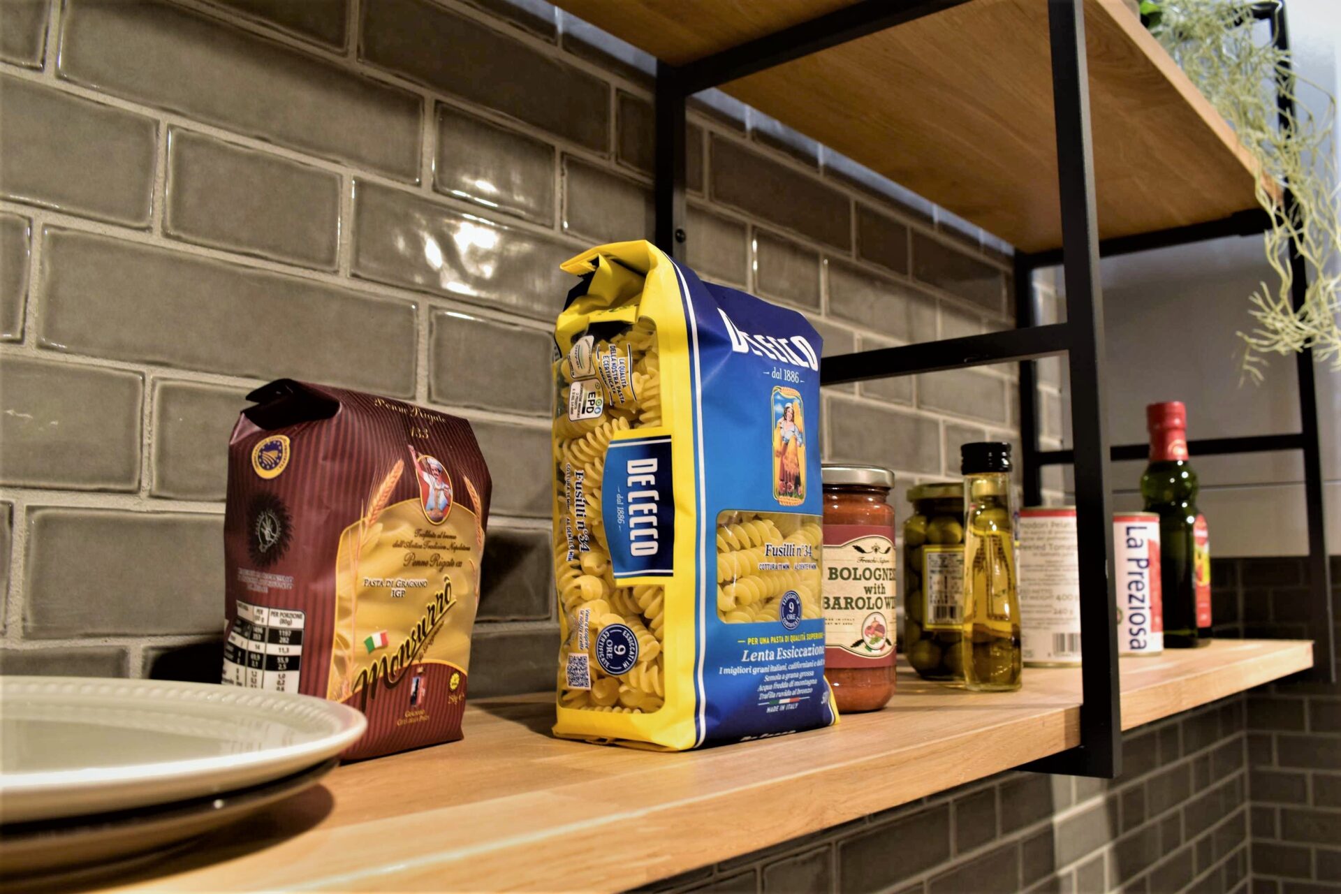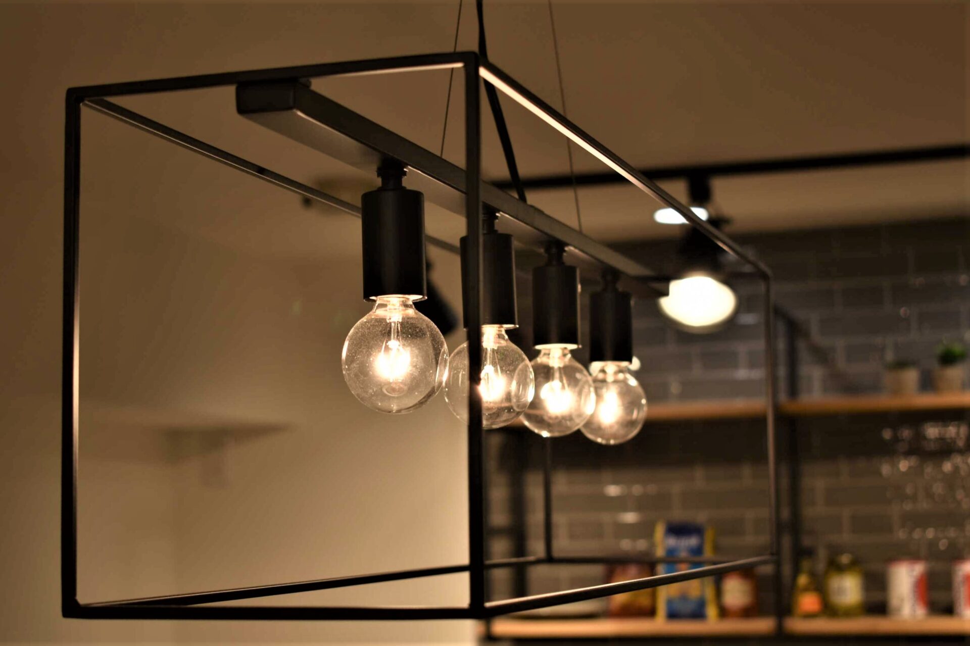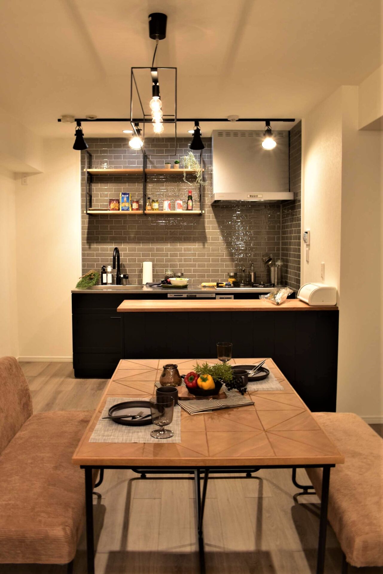 カップボードの羽目板やオープンラックのアイアン、タイルの石目など、それぞれの素材感を楽しめるように照明の位置や明るさにもこだわりました。