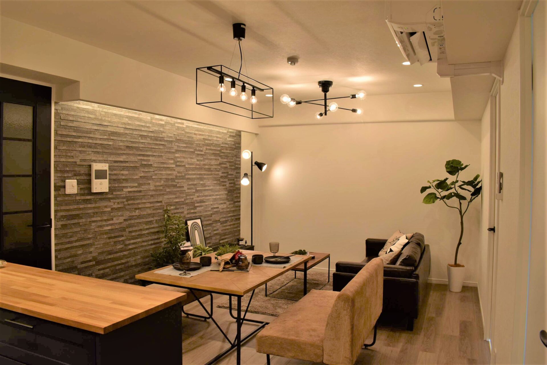 照明で際立つ素材感 アイアン調家具が映えるLDK