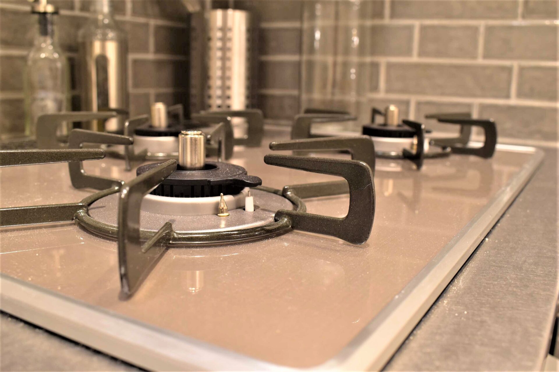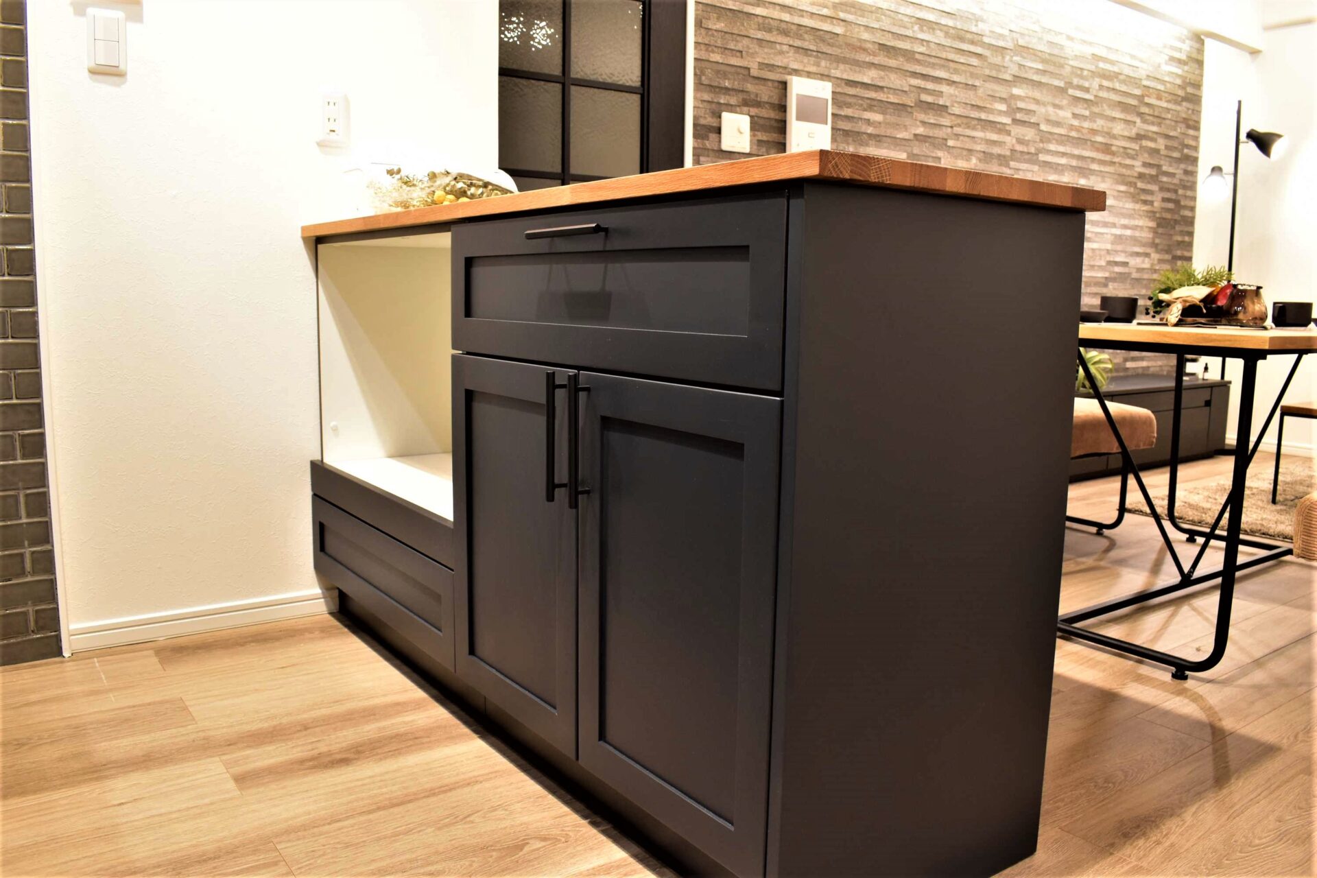 キッチンは壁付けのまま、設備の新調・吊戸棚の撤去・垂れ壁の撤去・カップボードの新設で、広さをそのままに解放感のある空間へ。