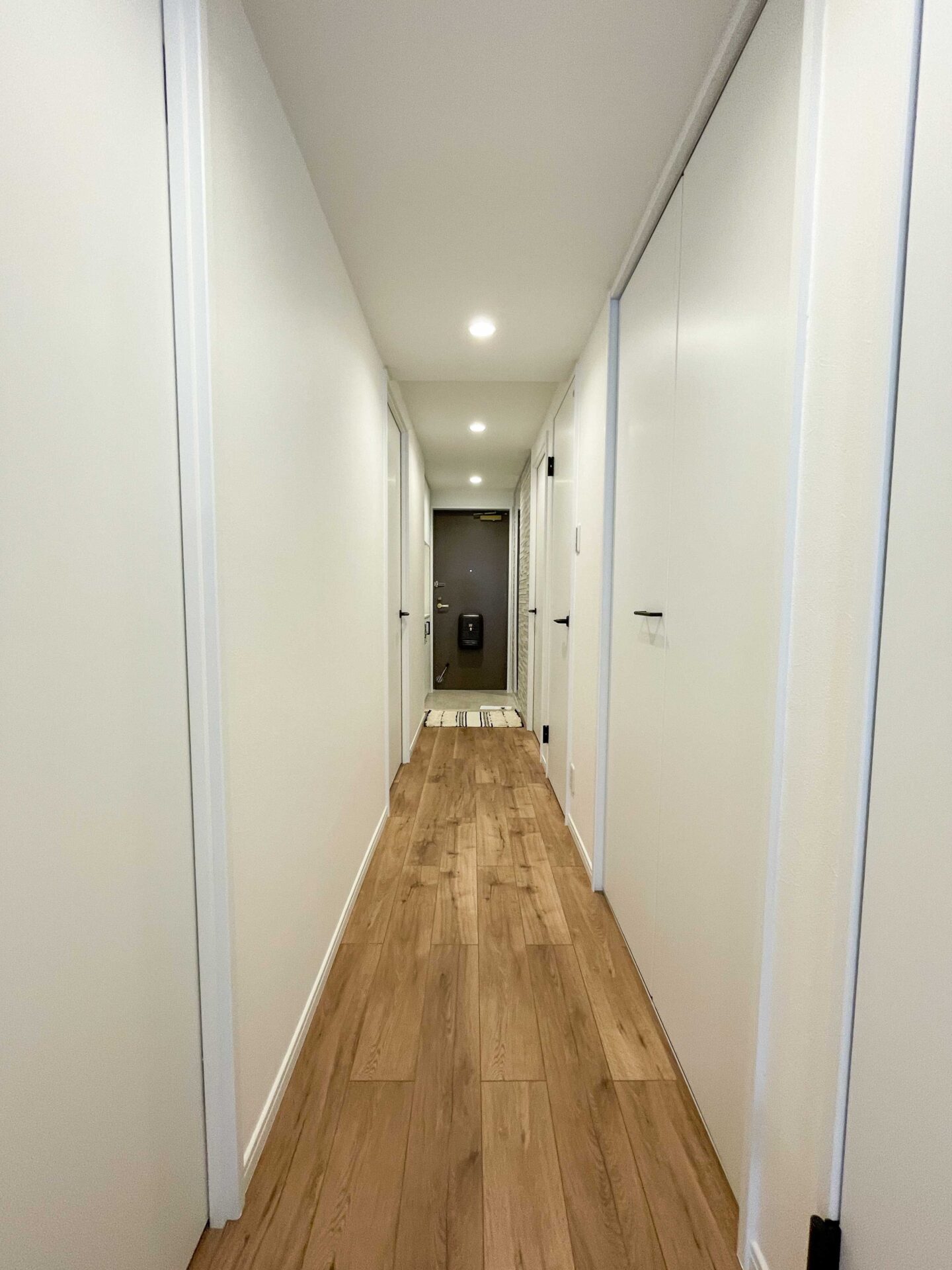 お部屋全体の木目は色味を合わせ、洗面やトイレにはヘリンボーンのクッションフロアを採用してモダンさをプラス。