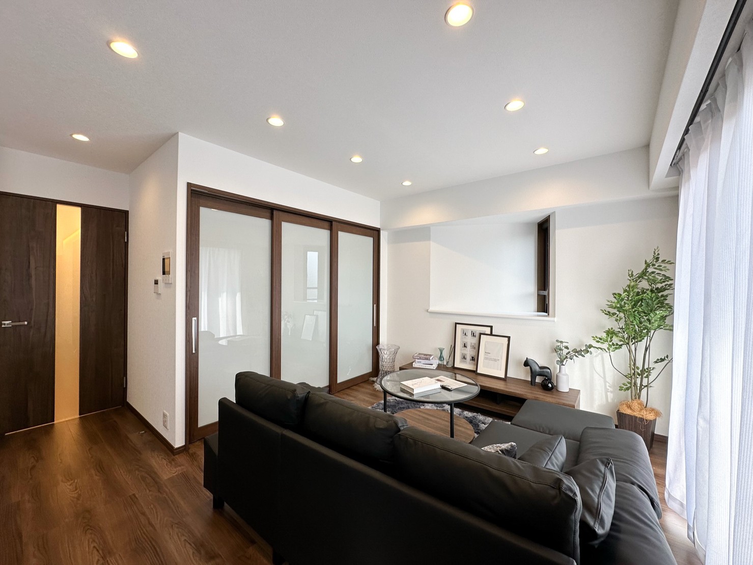 特に、面積が大きくなるリビングに隣接した洋室の3枚の引戸は、すりガラス調のものを採用して、完全に閉じていてもほんのり光を通すので閉塞感がありません。