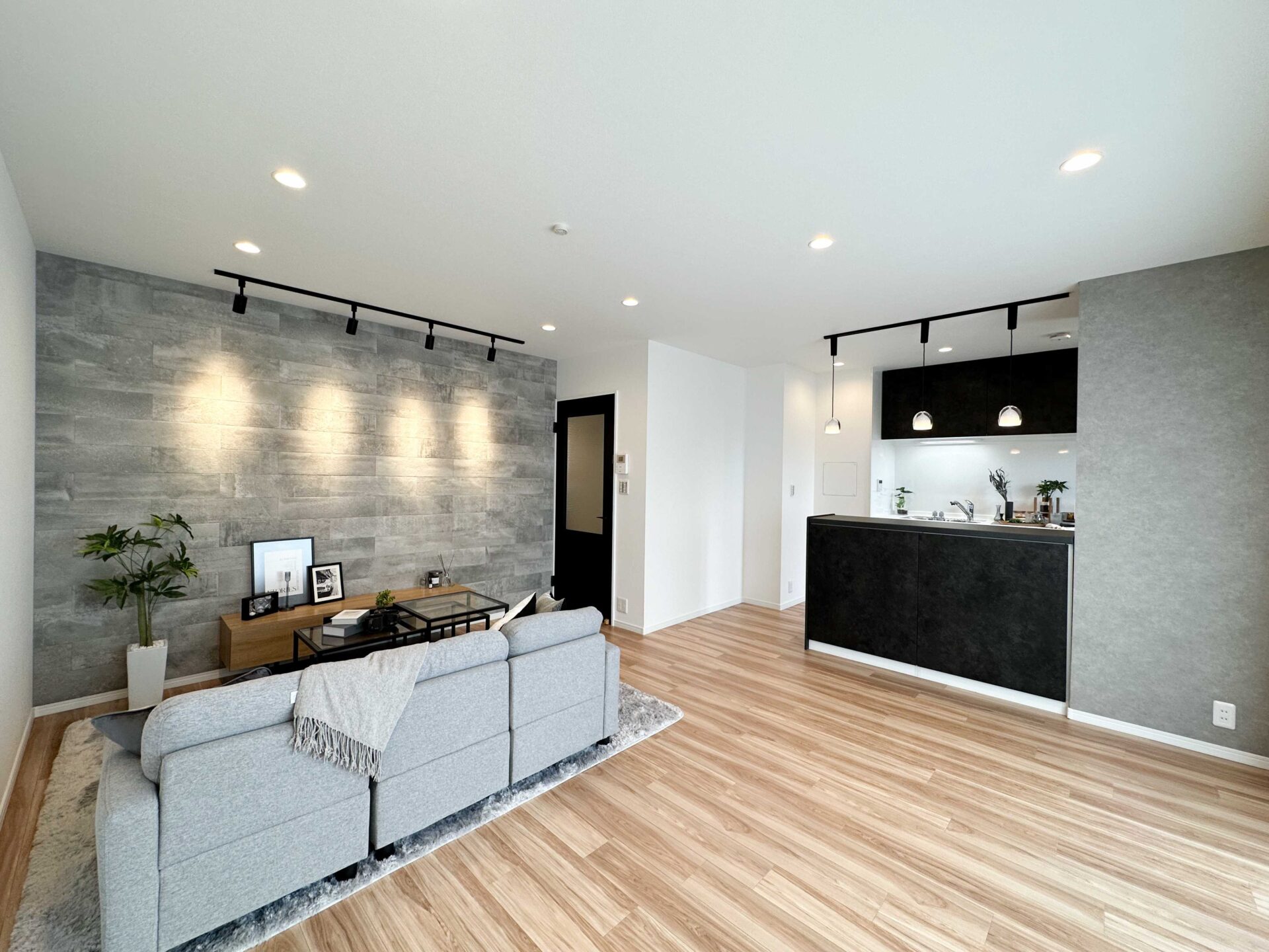 ナチュラルカラーに締め色のブラックを合わせて、ぼやっとさせない内装に。