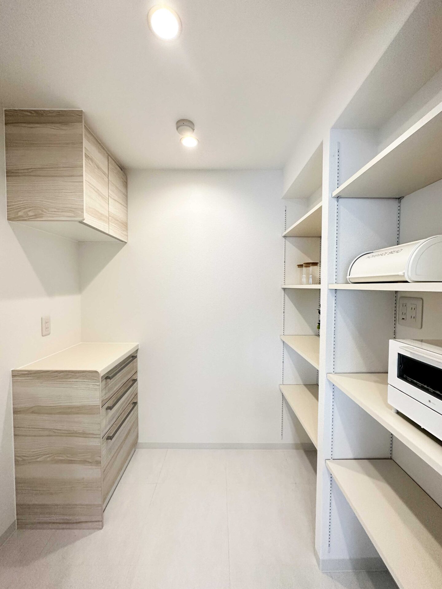 キッチンは壁付けからアイランド&ステージ型に配置変更し、パントリーも新設しました。