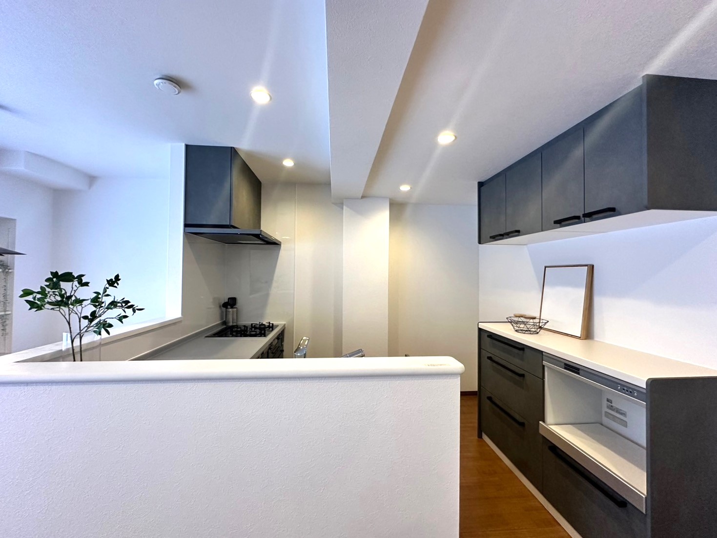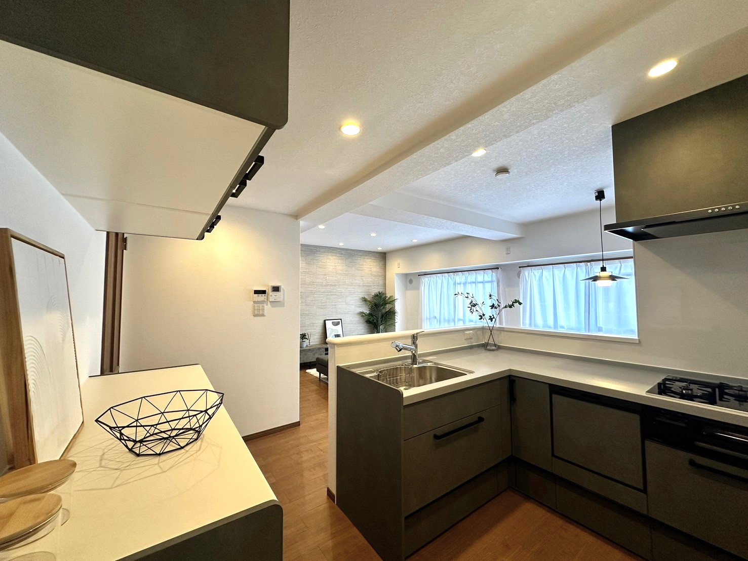 壁付けキッチンはオープンなL型へ変更。
