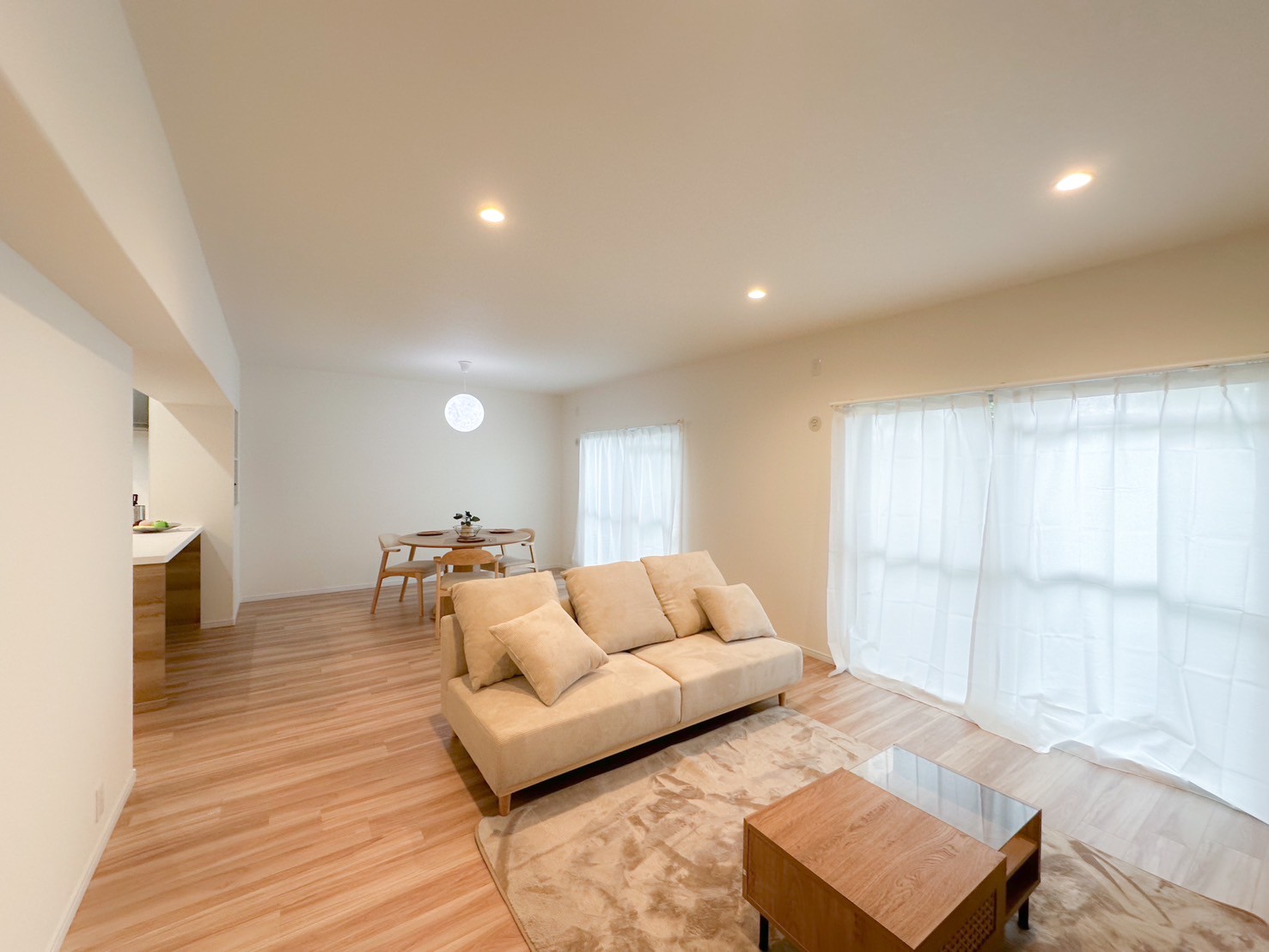 たとえば、無垢フローリングのやわらかな足ざわり、カーテン越しに光がふんわり差し込むリビング、北欧デザインの家具を合わせたリラックスできる空間。