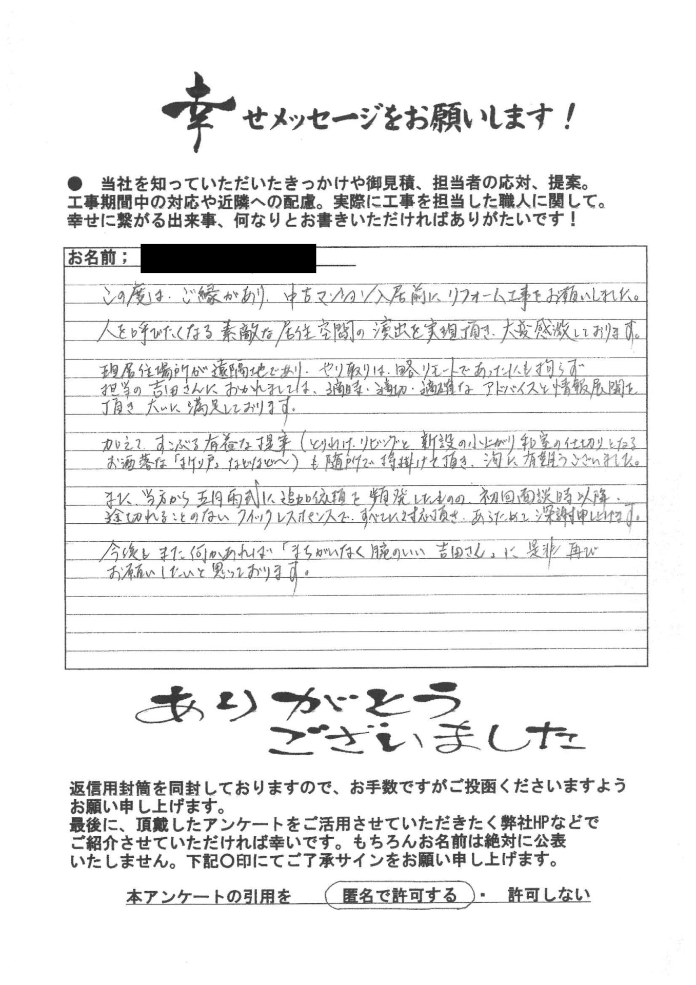今後もまた何かあれば「まちがいなく腕のいい吉田さん」に是非再びお願いしたいと思っております
